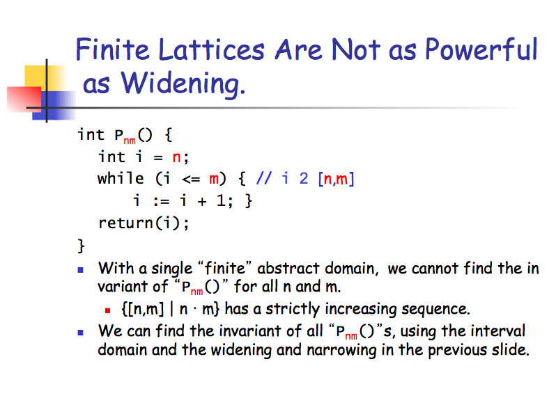Added to my last email, I would like to know the possibilities from PPL to symbolically manipulate interval domains? The attachment is a slide of Yang Hongseok on the subject widening/narrowing. He gave an example to show that finite abstract domains are in general less powerful than widening/narrowing approaches.